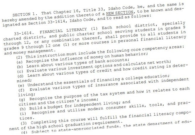 In 2023, the Idaho legislature adopted HB 92 which added section 33-1614 to Idaho code. This established provisions requiring courses in financial literacy for high school students. The content of many of the topics included on this site directly addresses required areas of the legislation.